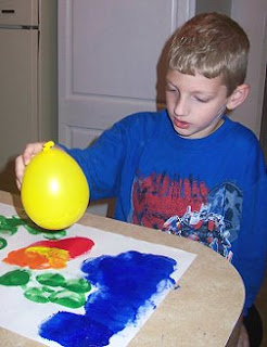 Encontrei esta pintura e achei o máximo. Encha balões pequenos e, se preferir, trabalhe as cores utilizando a mesma cor para as tintas e balões.